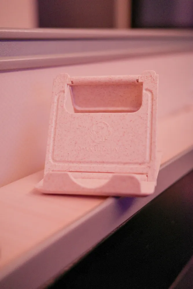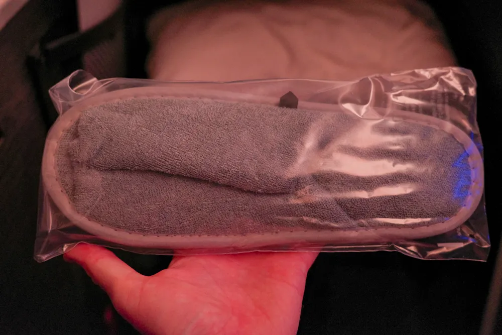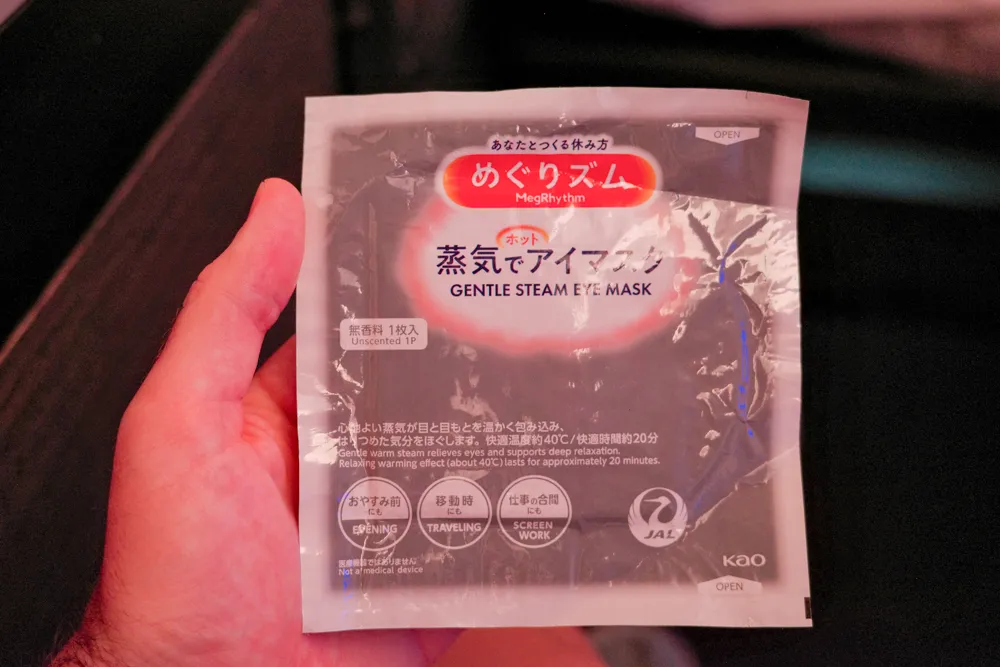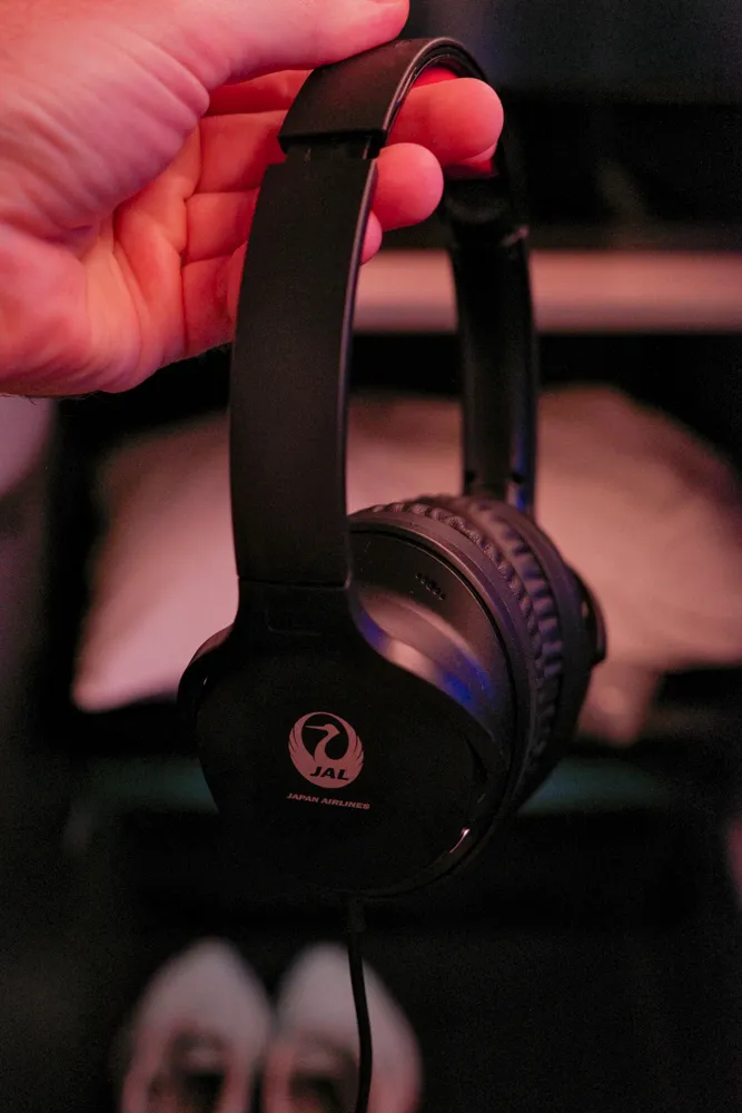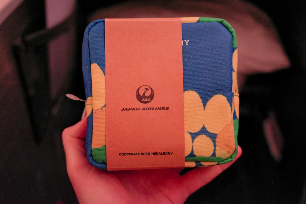 The amenity kit arrived in a vibrant, colorful Heralbony case that immediately caught my attention. Inside, JAL had included everything a long-haul passenger could need: a USB iPhone cable, a plastic phone stand (surprisingly useful), quality noise-cancelling headphones, the signature gentle steam eye mask, a toothbrush, a regular eye mask, and comfortable slippers. These thoughtful touches set Japan Airlines apart from competitors.